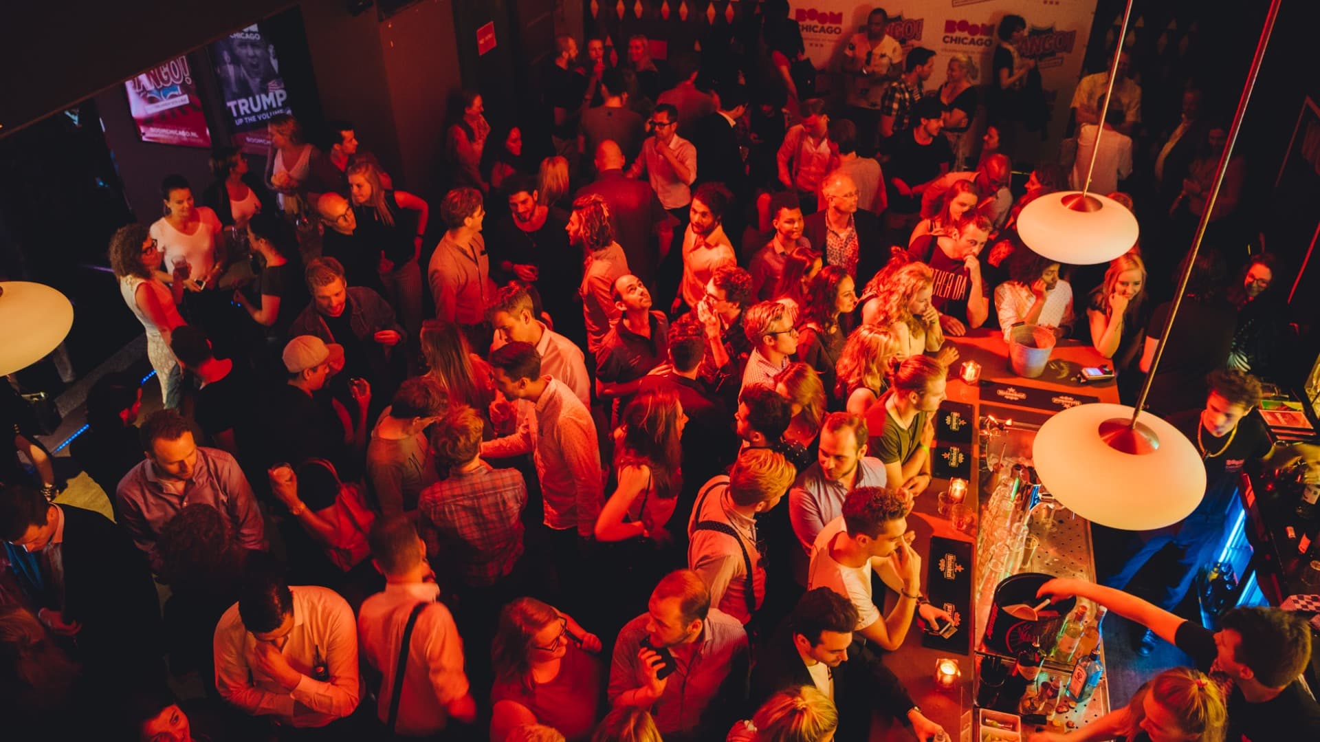 Bij Boom Chicago zitten gasten aan tafels en kunnen ze voor en tijdens de show genieten van drankjes. Na afloop kunt u samen met de cast een drankje drinken aan de bar. U zult deze toekomstige beroemdheden misschien nooit meer zo dichtbij zien!