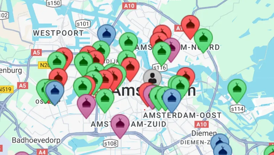 Wist je dat Amsterdam meer dan 30 moskeeën telt? Stap tijdens de ramadan eens binnen en ervaar de rust en gastvrijheid. Bezoek bijvoorbeeld de historische Fatih Moskee in een voormalige kerk aan de Rozengracht, de moderne Westermoskee aan de Schinkel of de opvallende witte Taibah Moskee in de Bijlmer. Of wat dacht je van de Blauwe Moskee die opvalt door de plint van blauw geglazuurde baksteen? Tip: Draag respectvolle kleding (bedekte schouders/knieën), doe je schoenen uit bij binnenkomst en informeer vooraf naar bezoektijden.