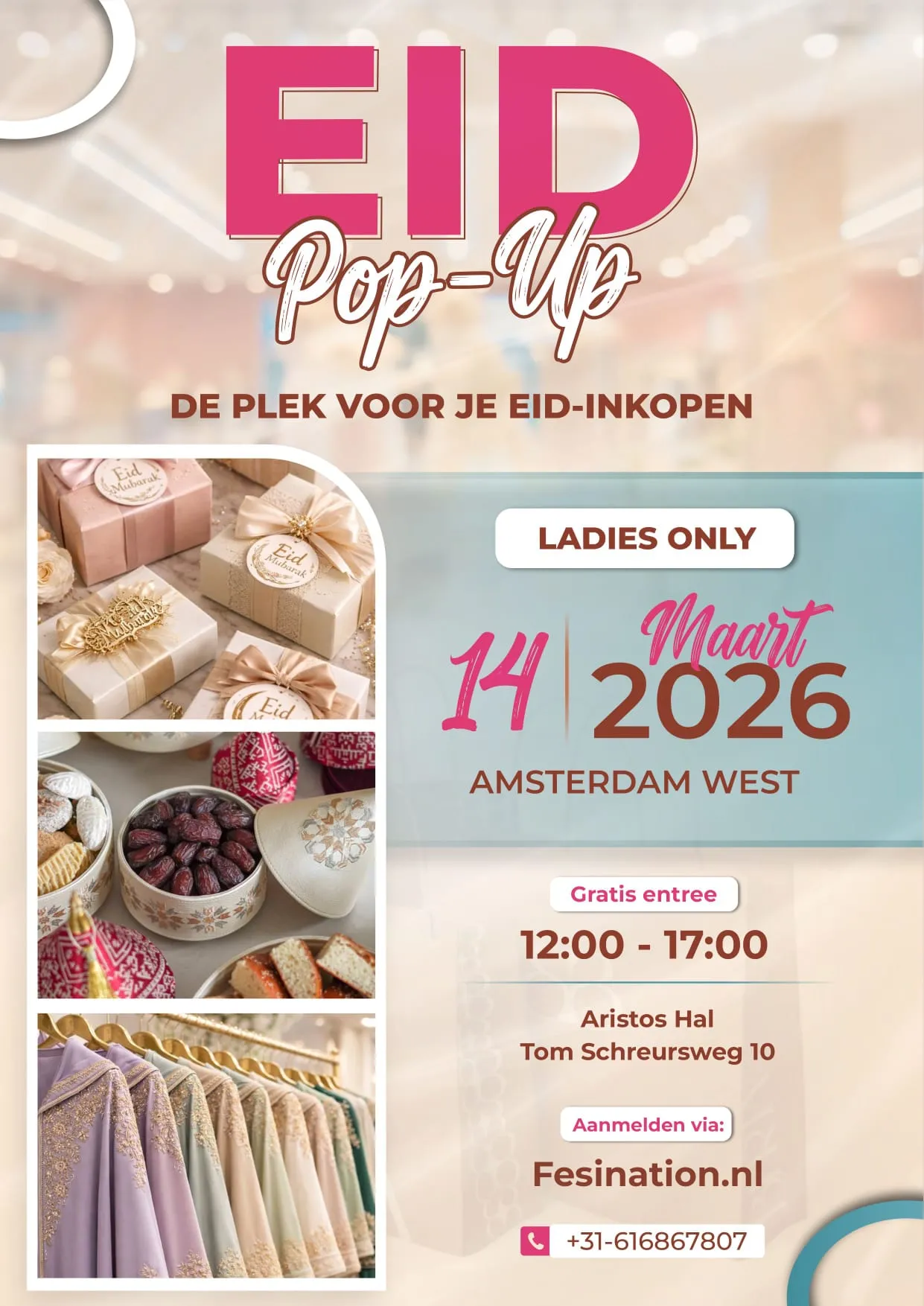 In de laatste week van de ramadan beginnen de voorbereidingen voor Eid al-Fitr. De Eid Pop Up brengt vrouwelijke ondernemers samen op één feestelijke plek. Verwacht kleurrijke kramen met bijzondere producten, van cadeaus tot sieraden en kleding. Ontdek heerlijke oosterse lekkernijen en laat je inspireren door de gezellige sfeer. Hier kun je in alle rust shoppen, proeven en genieten. Deze pop-up is exclusief toegankelijk voor vrouwen.