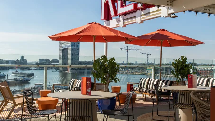Bekijk Amsterdam vanaf 85 meter hoogte bij Floor17, het dakterras van het Leonardo Hotel Amsterdam Rembrandtpark. Je kunt hier vanaf 12:00 terecht voor lunch of diner, waarbij je je tegoed kunt doen aan een klassieke burger, vis van de dag of kleinere hapjes. Zodra de zon ondergaat (en vaak al eerder) begint de bartender met cocktails shaken.