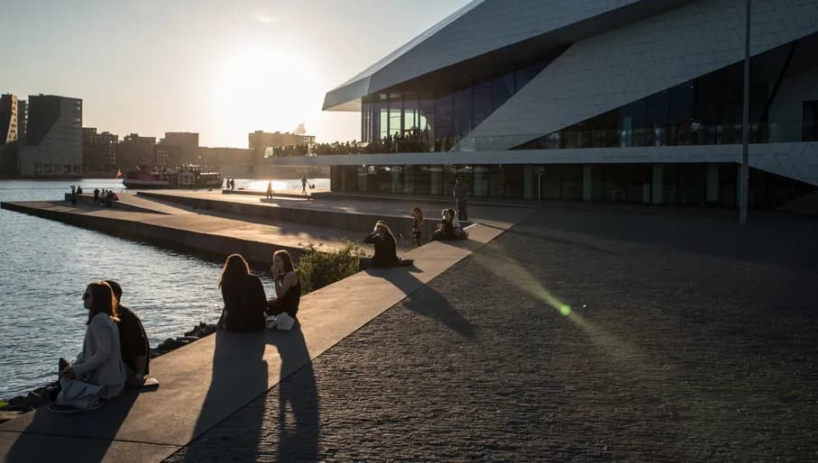 Bij Eye Filmmuseum zie je de zon achter de stad verdwijnen terwijl je ontspannen aan het water zit. Mooi uitzicht, drankje erbij; de start van een perfecte avond.